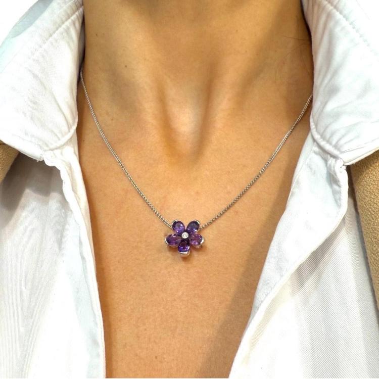 Collier Lionel Meylan Or 18Ct Fleur Amethyste & Brillant